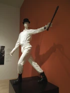 В фильме же Алекс, во время похождений со своими друзьями, был одет в белые штаны, рубашку (с необычными запонками в виде окровавленных глазных яблок), гульфик "песочница" (который в киноверсии представлял из себя отдельный элемент одежды и надевалась поверх штанов) на подтяжках, берцы и котелок. Также на правом глазу ДеЛарж носил накладную ресницу. Иногда Алекс носил маску, похожую на маску чумных докторов, только без рта. Нос в этой маске был стилизован под мужской половой орган.