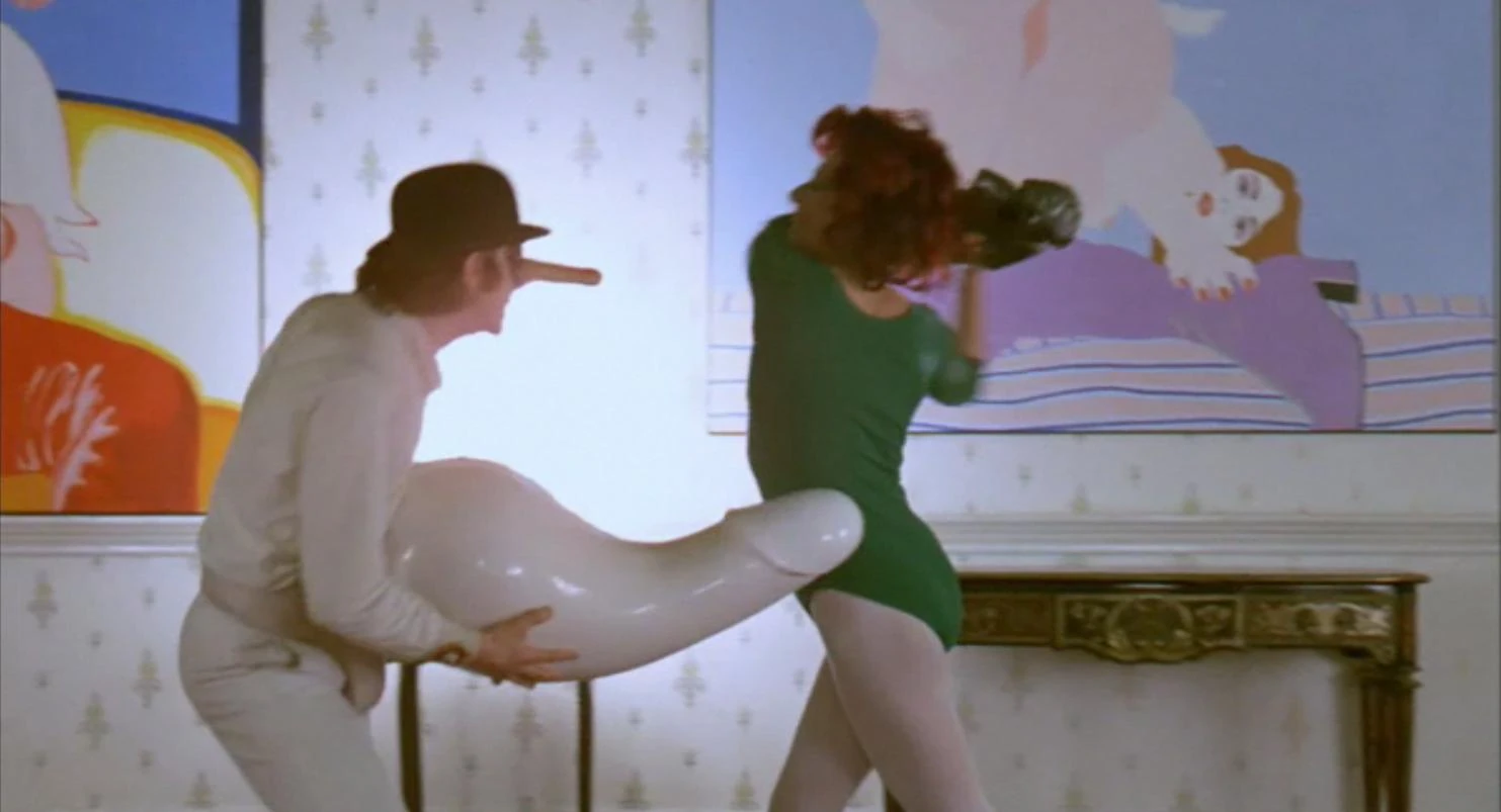 Алекс дистанцирует нападающую на него женщину с помощью скульптуры "Rocking Machine".
