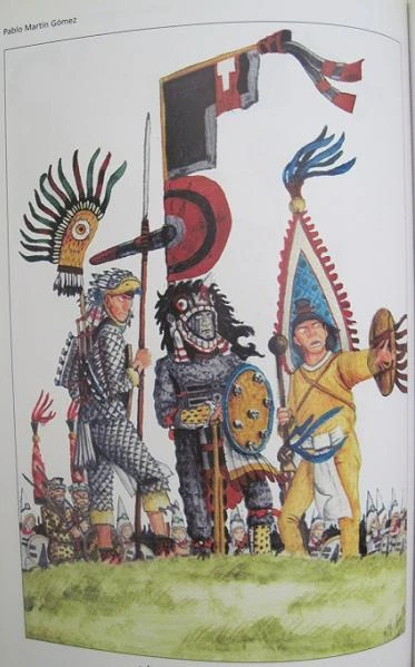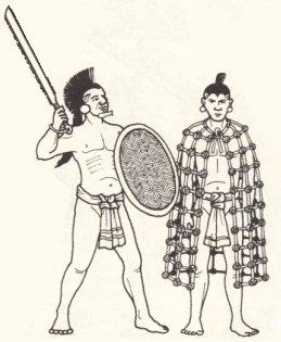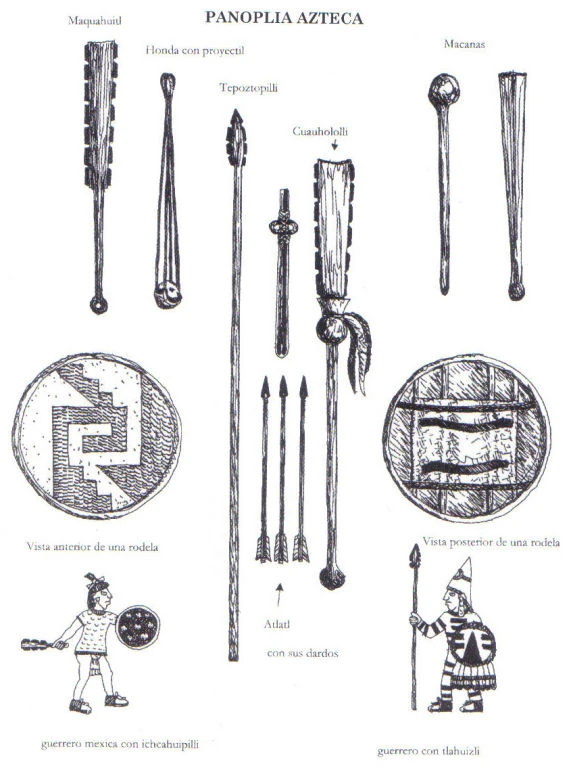 Главным оружием нападения являлись палицы, усеянные острыми кусками обсидиана. Плетенные из прутьев щиты, покрытые кожей, и хлопчатобумажные панцири и штаны, пропитанные рассолом, были столь прочными, что испанцы заменили ими свои тяжелые латы. Применялись и ватные доспехи, встречавшиеся в Китае, Японии, Корее, России и в Африке у племени борку.