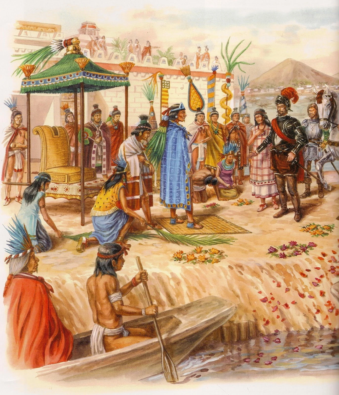 Город так же велик, как, например, Севилья. Улицы его широки и прямые, как стрелы. Половину улицы образует мостовая, другую половину — канал, по которому плавают лодки. В городе много рыночных площадей. Одна из таких площадей больше, чем весь город Саламанка. Ежедневно на ней собирается более 60 тысяч людей. Вдоль ведущих в город насыпей тянутся два трубопровода диаметром в два хороших шага. По глиняным трубам в город поступает пресная вода. Вторая труба — запасная, чтобы подача воды не прекращалась во время чистки первой трубы. В городе много различных ремесленников. В цирюльнях моют и стригут волосы. В кухмистерских подают самые разнообразные кушанья и напитки. Во время трапезы под каждым блюдом находится жаровня с раскаленными углями, чтобы еда не остывала.