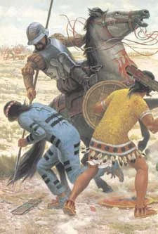 В 1521 г. ацтекам пришлось вступить в неравную борьбу с немногочисленным, но технически сильным врагом — испанскими колонизаторами, широко пользовавшимися методом коварной политики. Губернатор острова Кубы поручил испанскому дворянину Эрнандо Кортесу разведать и завоевать на материке индейские территории, по слухам, богатые золотом.