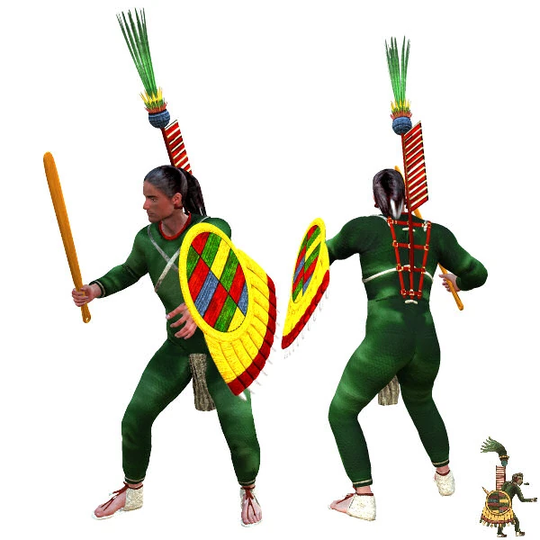 Знатный воин выступал в поход в хлопчатобумажном панцире, пропитанном для жесткости солью, с легким щитом и деревянным мечом (в деревянную основу вкладывались обсидиановые элементы). Знатный воин мог иметь и раба для переноски снаряжения.