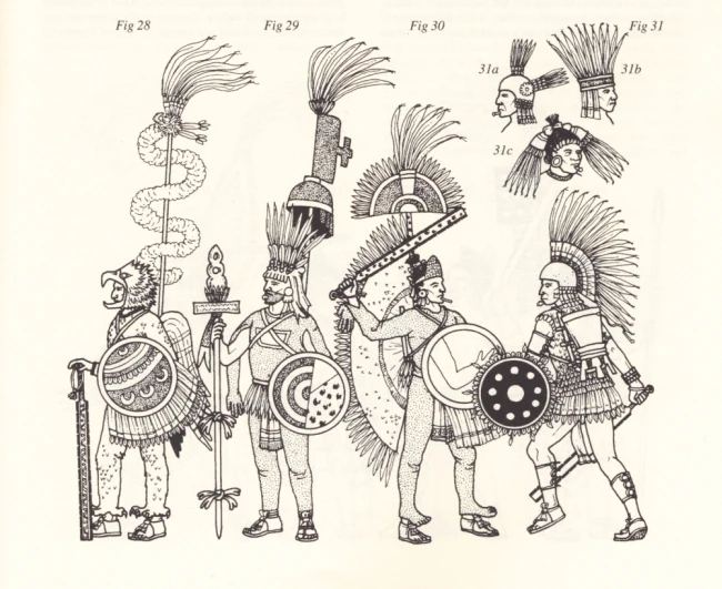 Как ни странно, военный аппарат ацтеков был устроен более чем хорошо, в отличии от индейцев Северной и Южной Америки. Разные классы воинов (в зависимости от кол-во плененных заложников) имели свою уникальную и неповторимую "униформу". О ней читайте в отдельных статьях, посвященных тому или иному классу ацтекских воинов.