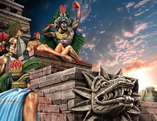 Бессмысленное уничтожение тысяч пленников-рабов на жертвенных алтарях ацтекских храмов было возведено в основу культа. Человеческое жертвоприношение стало центральным событием любого праздника. Жертвоприношения совершались чуть ли не ежедневно. В жертву приносили одного человека с торжественными почестями. Так, ежегодно из числа пленных выбирался самый красивый юноша, которому суждено было в течение года пользоваться всеми благами и привилегиями бога войны Тескатлипока, чтобы по истечении этого срока оказаться на жертвенном камне-алтаре. Но были и такие "праздники", когда жрецы отправляли в мир иной сотни, а по некоторым источникам, и тысячи пленных. Правда, в достоверность подобных утверждений, принадлежащих очевидцам конкисты, трудно поверить, но мрачная и жестокая, не признающая компромиссов религия ацтеков с массовыми человеческими жертвоприношениями не знала пределов в своем ревностном служении правящей кастовой аристократии.