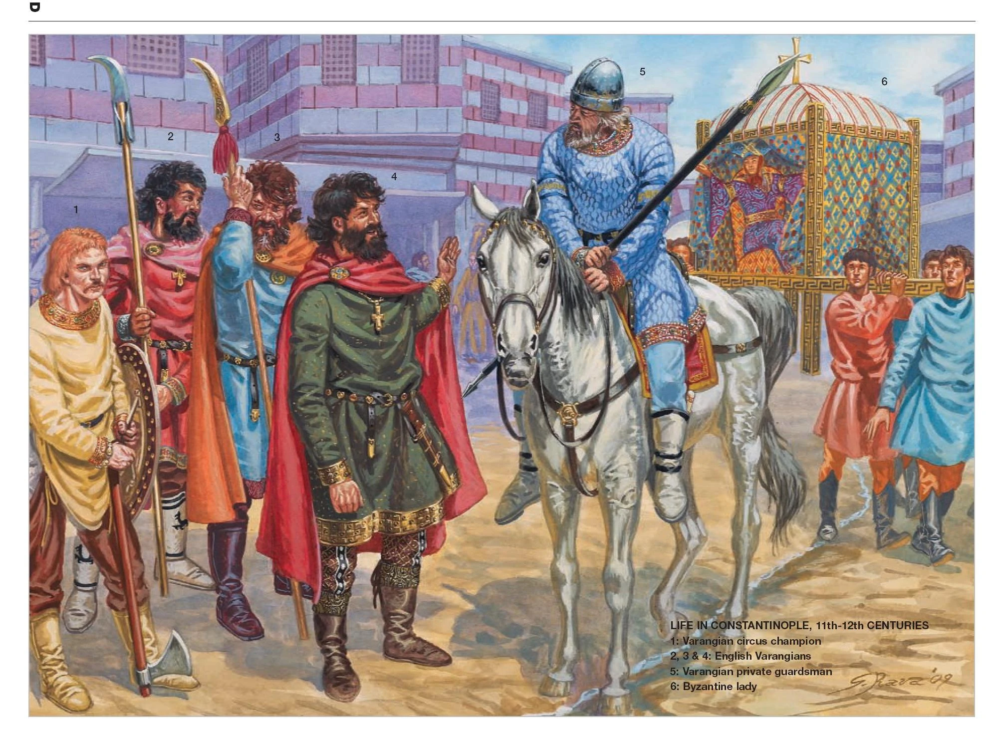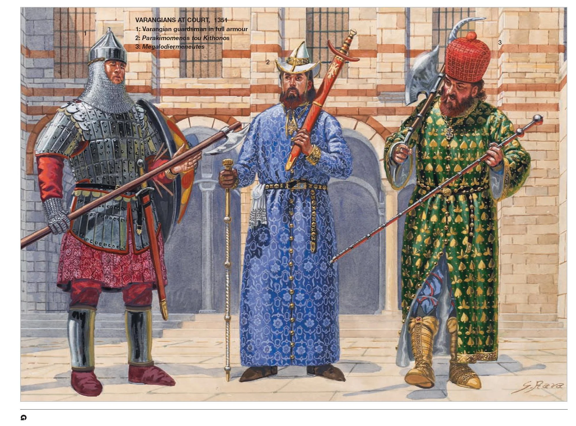"Между прочими, которые от города Константинополя жалованье получают, датского языка люди первую воинскую степень имеют, и их караулом царь здравие своё защищает. И когда он [Эрик I] в Константинополь прибыл, то варанги от императора получили позволение к королю своему прийти."
