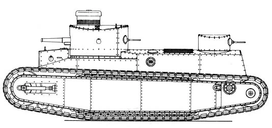 Проект ГУВП* был рассмотрен военной комиссией в конце 1925 года. При наличии определенных преимуществ было отмечено, что разработчики не смогли уложиться в отведенный им весовой диапазон, бронирование недостаточно, а схема размещения вооружения (особенно орудия главного калибра, не имевшего возможность вести круговой обстрел) далека от оптимальной. Так, в 1926 году, появился значительно модифицированный проект среднего танка ГУВП**, ещё более походивший на французский FCM 2C. Громоздкая надстройка, вместе с “барбетными” пулеметными установками, была ликвидирована, хотя бортовые пулеметы всё же оставили. Теперь из вооружения, установленного в главной башне (45-мм пушка обр.1925 г. и кормовой 6,5-мм пулемет), экипаж имел возможность вести круговой обстрел, не считая узкого сектора, “съедаемого” малой пулеметной башне на корме танка. Оригинально была решена конструкция ходовой части. Для лучшей подвижности танк предполагалось оснастить оригинальным движителем, состоявшим из двух бесконечных лент, вложенных одна в другую. Внешняя лента была резинометаллической тросового типа, а внутренняя – из серии опорных катков, соединенных цепью Галля. Опора танка на цепь катков осуществлялась при помощи салазок, имеющих мягкую пружинную подвеску. Дополнительно была предусмотрена установка двух тележек с двумя “натяжными” катками в каждой и пружинной амортизацией. Расположение направляющего и ведущего колёса не изменилось.