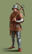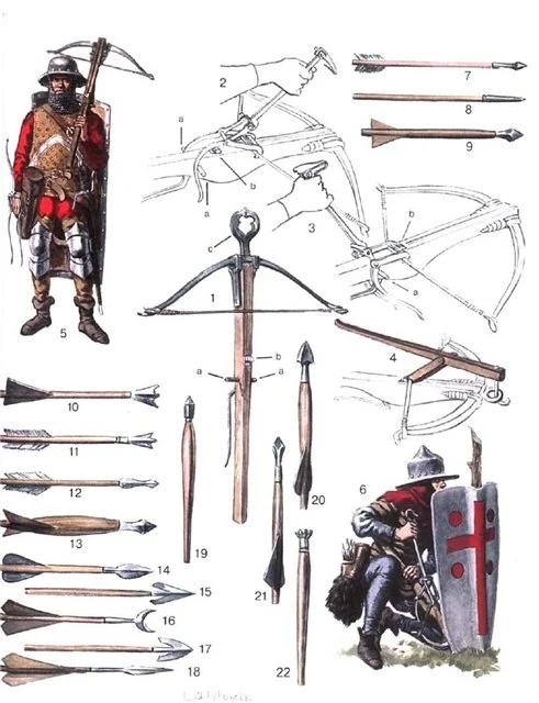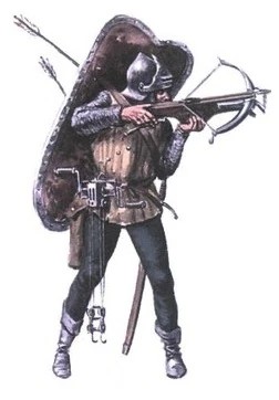 - Вооружение: арбалет, колчан с болтами (18 или 36 штук, согласно ордонансам; остальные везли на повозках в обозе), меч и хороший кинжал.