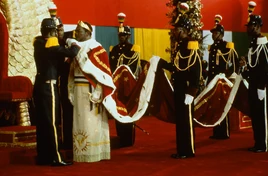 Бокасса I на императорском троне со своим гвардейцем (справа).