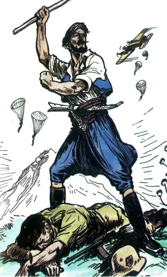 Старый критянин бьет немецкого парашютиста.