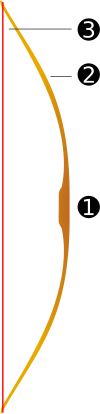 Части лука: 1-рукоять, 2-плечи, 3-тетива.