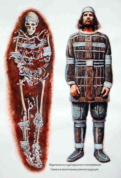 И археологические данные, и искусство этих охотников на мамонта сохранили нам и облик их одежды, которая, что естественно для тогдашнего климата, больше всего напоминала одежду сегодняшних эскимосов: мех, вывернутый внутрь и богато расшитый костяными бусами, на голове — теплая шапка, на ногах — меховые сапоги. В погребении верхнепалеолитических людей в Сунгири под Владимиром (27 тысяч лет назад) были найдены сотни костяных бус и остатки именно такой одежды.