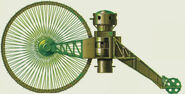 1 – ходовое (ведущее) колесо, 2 – ступица, 3 – ось ходовых колес, 4 – рубка управления орудийным спонсоном левого борта, 5 – орудийный спонсон правого борта, 6 – цепной привод управления орудийным спонсоном, 7 – верхняя пулеметная башня, 8 – нижняя пулеметная башня, 9 – броневой капонир входного лаза, 10 – входная дверь, 11 – хвостовая станина, 12 – ходовая рубка (пост управления), 13 – верхний люк, 14 – каток хвостовой направляющей тележки, 15 – несущая рама, 16 – поворотная ось, 17 – шток пружинной рессоры, 18 – пружинная рессора. Буквами обозначены элементы привода: А – тавровый обод ведущего колеса, Б – приводные (автомобильные) колеса, В – коническая шестеренчатая пара, Г – фрикцион, Д – двигатель "Майбах".