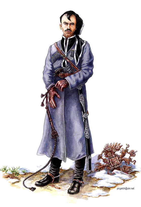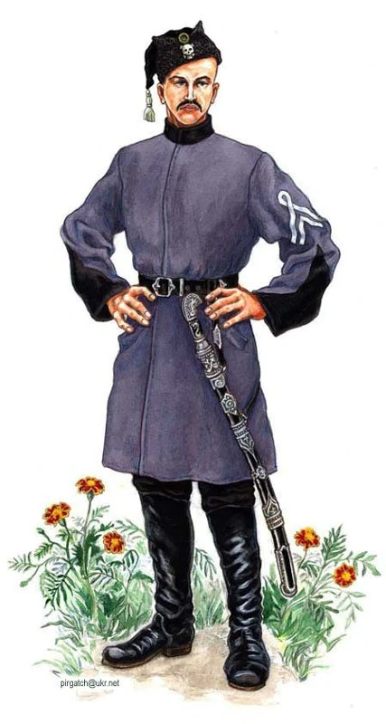 Старшина полка Чёрных запорожцев, 1919 г. Несмотря на то, что черкеска здесь имеет фиолетовый оттенок, на самом деле она была светло-серой. Художник Богдан Пиргач.