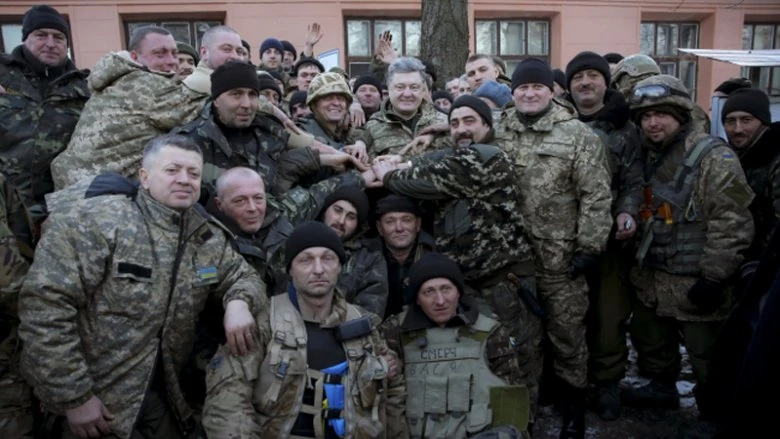 Президент Украины П. Порошенко на встрече с бойцами 128-й бригады, вышедшими из Дебальцево, г. Артемовск, февраль 2015 г.