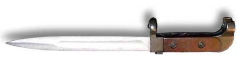 Рукоятка изготовлена из стали и покрыта деревянными накладками. Односторонняя гарда и загнутое навершие служат для фиксации штыка на стволе автомата и помогают удобнее удерживать его в руке. Это оружие может использоваться и как штык, и как нож.