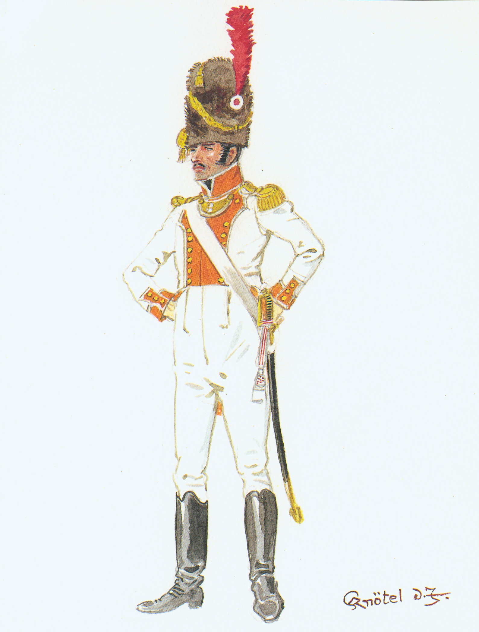 Артиллеристы носили синие мундиры с отделкой оранжевого цвета, белые панталоны и черные гетры.