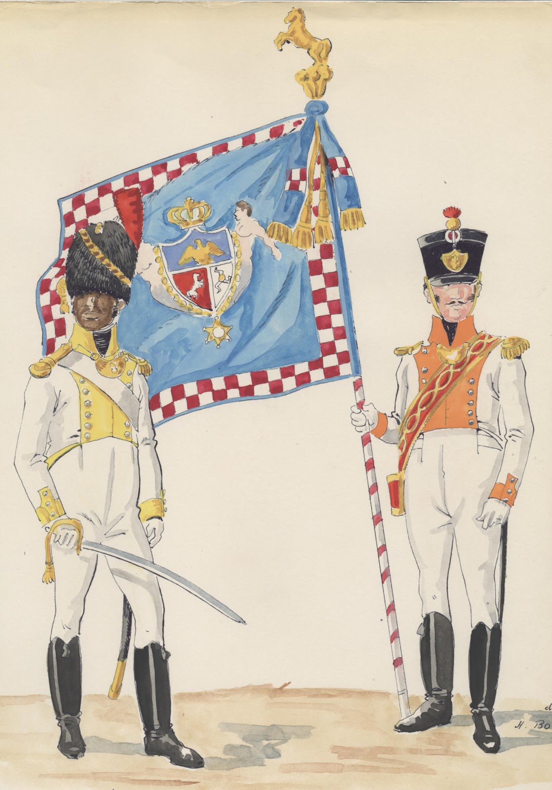 Офицер гренадеров 7-го Африканского линейного полка (слева) и знаменосец 6-го линейного полка неаполитанской армии, 1812 г.