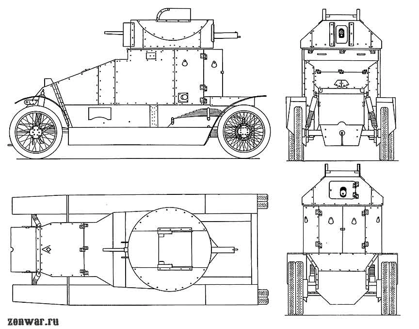 Обзор водителю и командиру машины, которые располагались в отделении управления. обеспечивало узкое лобовое окно, прикрываемое в боевой обстановке бронекрышкои с двумя смотровыми щелями а также два маленьких окна в бортах. В кормовой части машины имелась открытая платформа, на которой можно было перевозить дополнительное военное имущество или несколько пехотинцев. С нее же через дверь в задней стенке корпуса члены экипажа входили в бронемашину и выходили из нее.