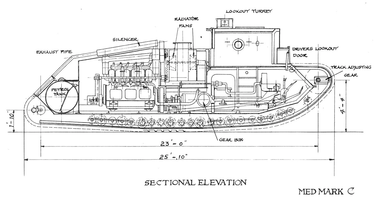 структурой, или Каземат, хорошо вперед, оснащенный шаровыми креплениями для пяти пулеметов. Тем не менее, средний Mark C Триттона был гораздо более длинным автомобилем. У него был отдельный моторный отсек сзади, как у Medium B, но здесь он был достаточно большим, чтобы разместить обычный 6-цилиндровый двигатель Ricardo за стандартной эпициклической коробкой передач. Также к нему можно было легко добраться из боевого отделения. Больший двигатель означал, что танк имел лучшую скорость (около 8 миль / ч (13 км / ч)). Большая длина дала ему главную способность скрещивания шанца. Топливный бак, вмещающий 150 imp gal (680 л) бензина, допускал дальность 140 миль (230 км). Поэтому общая мобильность была намного лучше.