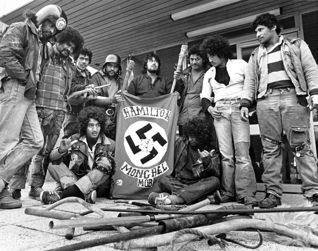 Члены Mongrel Mob сдают свое оружие полиции во время добровольной сдачи вооружения в 1979 году.