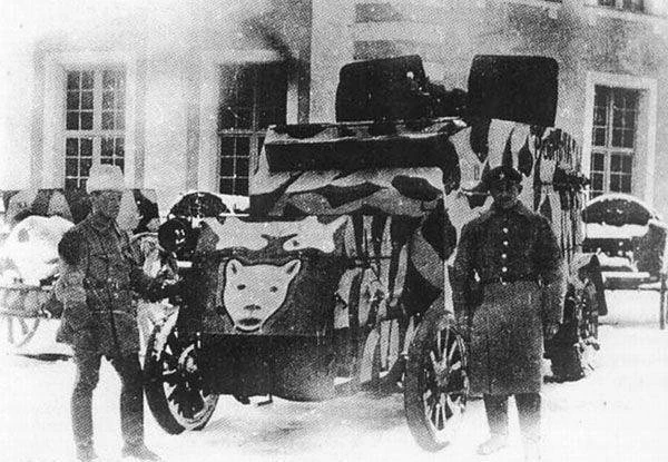 Броневик, доставшийся эстонской армии. Вместо тумбы с пушкой установлена башня с пулеметами.