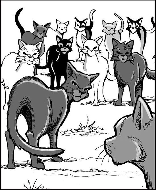 She starts by announcing ThunderClan's need for more warriors and she adds that they will take in an outsider to train for a Clan meeting. The Clan's unhappy and Bluestar isn't surprised. She continues by saying that she's found a cat that is willing to become a warrior. A pale tabby calls that any cat would be lucky to become an apprentice of ThunderClan and Bluestar counters that Whitestorm and Lionheart agree that Rusty should join the Clan. Another cat asks what Clan he belongs to and says that he doesn't carry Clan scent. The tabby tells the Clan to look at his collar adding that he's a kittypet. He thinks that the Clan needs more forest born cats to join, not kittypets to feed.