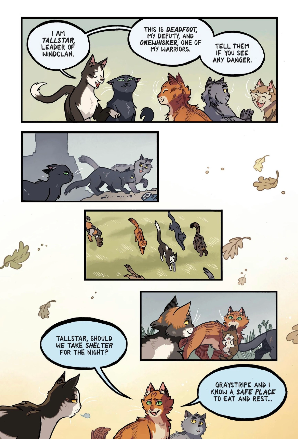 - At the Gathering, Bluestar advocates for WindClan's return, despite the other two Clan leaders disagreeing.[14] She assigns two of her warriors, Fireheart and Graystripe, to search for the lost Clan and bring them home.[7] While Fireheart and Graystripe are searching, RiverClan and ShadowClan patrols hunt in WindClan's former land and chase away three WindClan stragglers.[13] The two ThunderClan warriors find WindClan hiding in a tunnel underneath a Thunderpath in a maze of massive Thunderpaths.[1] Tallstar and his cats are eager to return to their home once they learn that Brokenstar is gone, and Fireheart and Graystripe guide them through the Thunderpaths towards Clan territory. After resting for the night at Barley's farm, Barkface interprets red clouds in the dawn as a sign of an unnecessary death.[15] Once WindClan arrives at their camp, Deadfoot and Onewhisker escort Fireheart and Graystripe back to their territory. However, while crossing RiverClan's land as a shortcut, they are attacked by Leopardfur and her patrol. Tigerclaw and his patrol arrive to help their Clanmates, but Whiteclaw falls to his death in the gorge.[5]