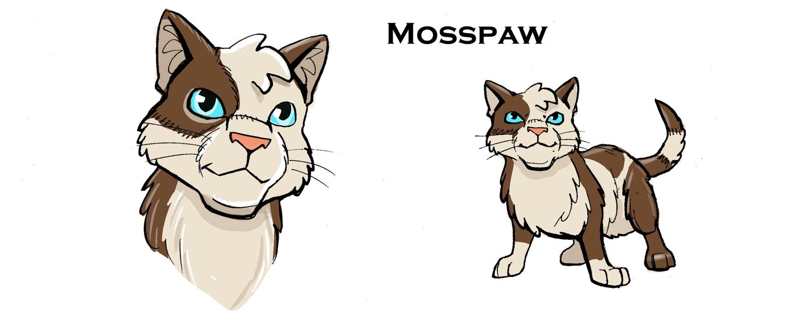 - On Vicky's Facebook, Mosspaw is a white tom with dark brown patches and green eyes.[22]