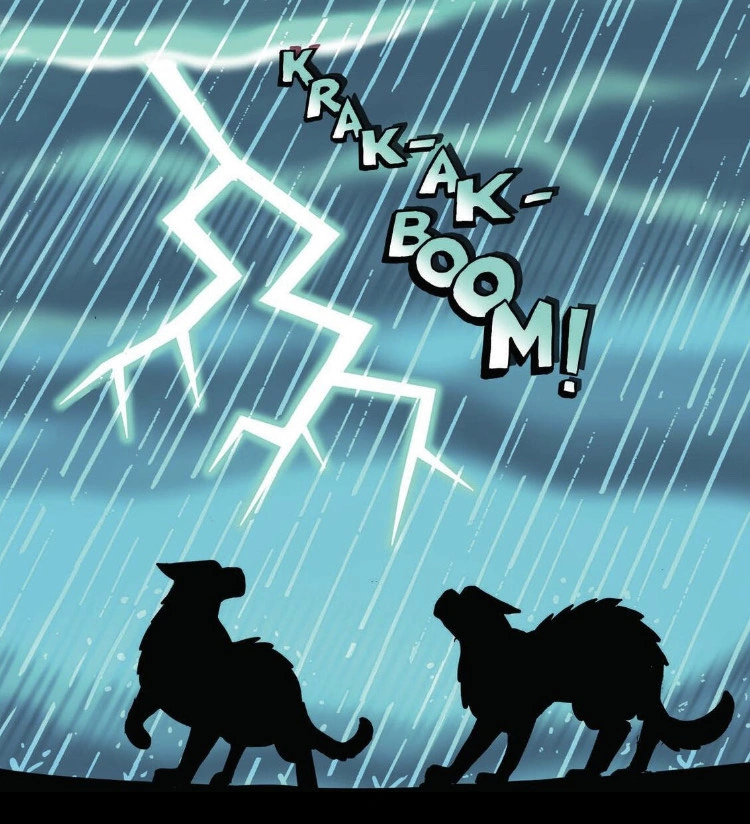 | "The rain became a downpour. And now the visibility was worse—much worse. Stripestar could barely see a tail-length in front of him. [...] The sky darkened. Thunder rolled. Then, quite suddenly, the storm broke with the ferocity of a snapping dog. The rain came down in a savage deluge that soaked every cat within a heartbeat. Lightning flashed, then faded to leave a darkness that was almost like night. The thunder that followed was so loud and long that it made Stripestar cringe, and several cats yowled out loud with shock." |