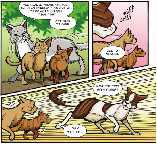 Waspwhisker and Leafstar confronting Nettlesplash and Sandypaw for eating food